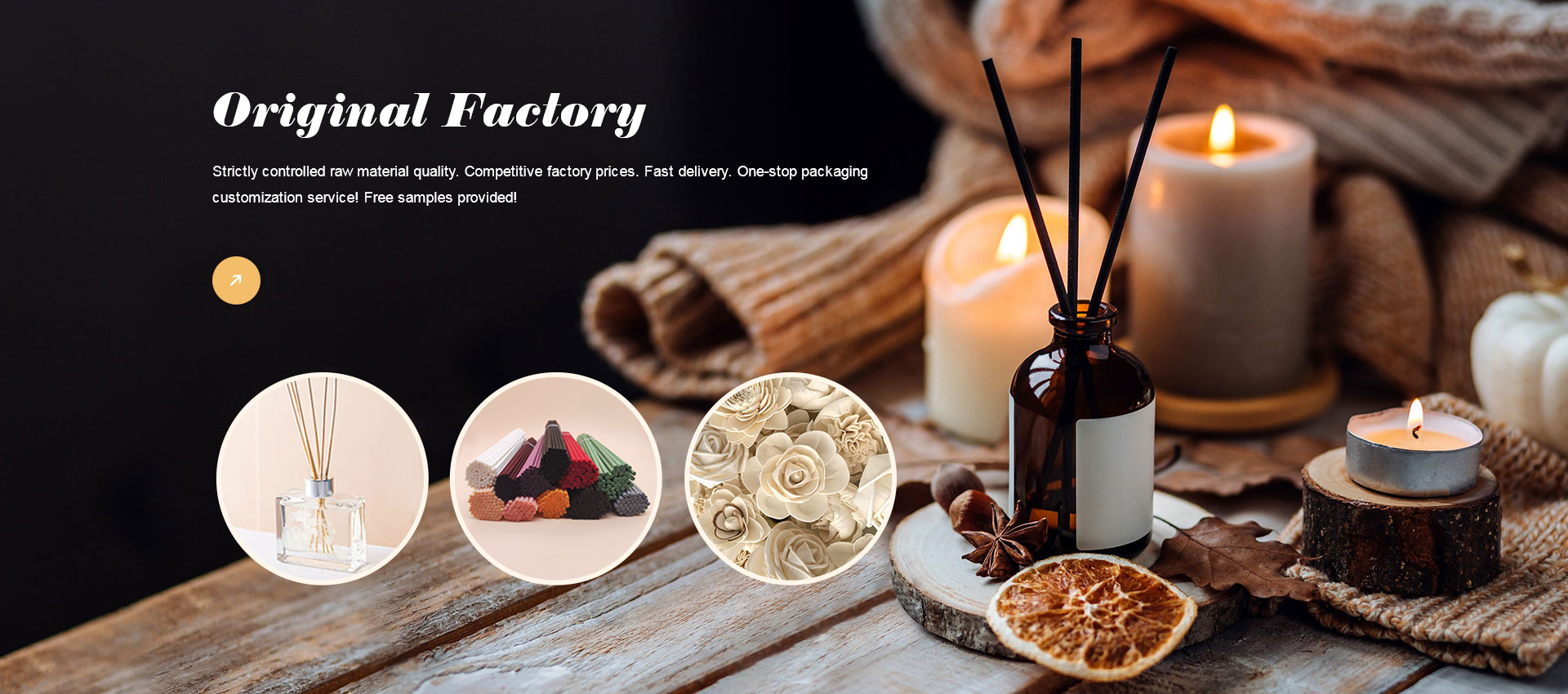 We also supply a range of related accessories, including handcrafted sola flowers, glass bottles for perfumes and aroma diffusers, perfume caps, and sprayers. Most of these products support OEM and ODM customization.